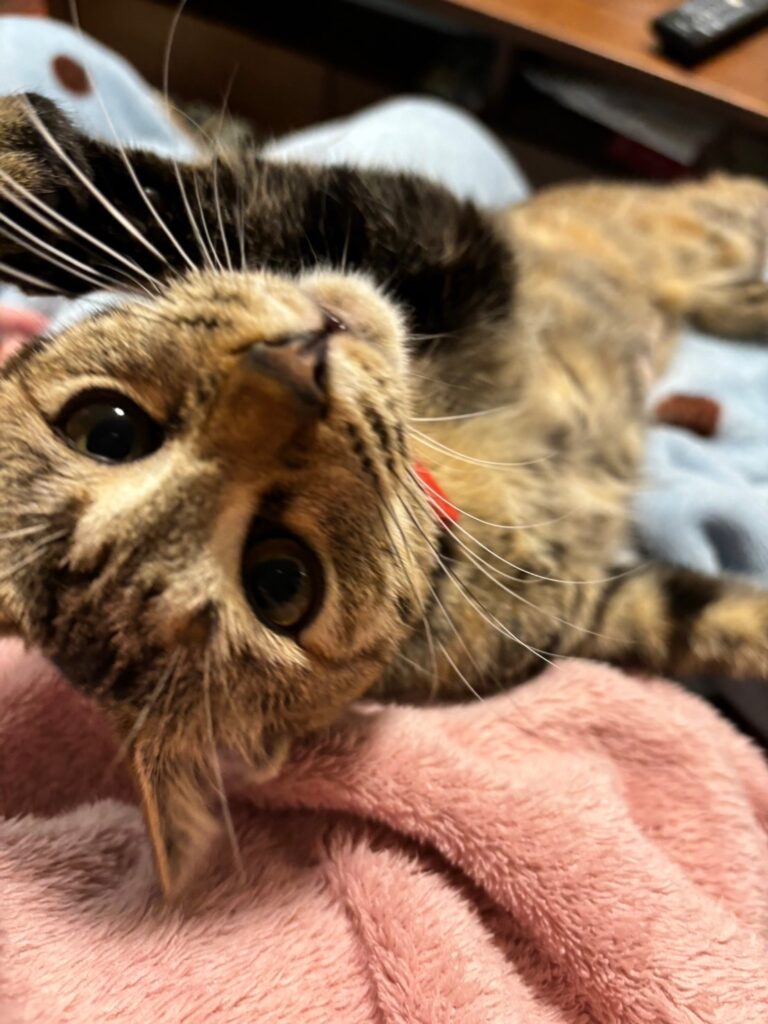 むぎは2023年5月生まれの女の子です。毛並みはなんとも不思議でお腹から上が虎柄、下がさび柄とくっきり分れています。