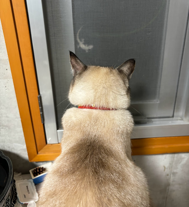 ちなみに窓に張り付いているのは、沖縄でおなじみのやーどぅ(ヤモリ)うちのにゃんこの遊び相手になっています。