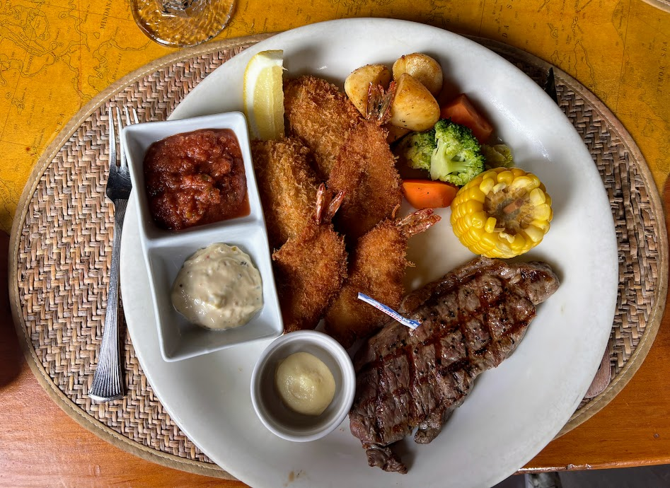 ランチメニューになってますがボリュームがすごくて満足度が高いです。サムズバイザシーという名前がついてるのでやっぱり海鮮がとても新鮮で美味しいです。お肉の堅さも選べますし、サラダもドレッシングが選べます。